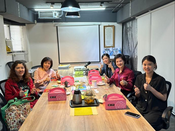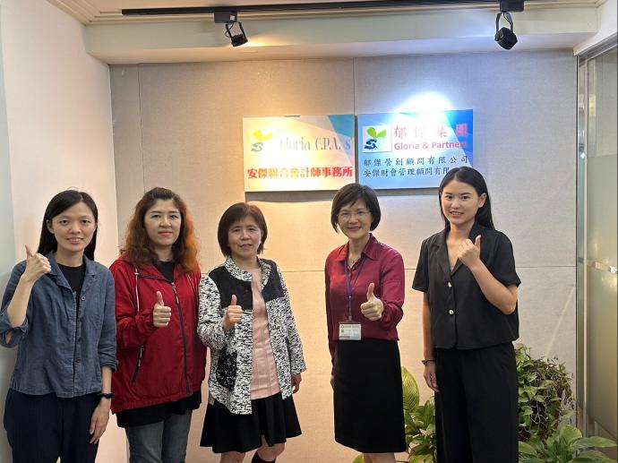 郁傑與文化大學產學合作,文化大學會計系兩位老師與實習生許同學、督導及執行長合影留念。